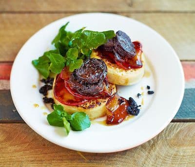 A perfect friendship of flavours: rich, crisp, gnarly black pudding; sweet, maple apples; and fresh, sharp, lemony watercress, served on the humble crumpet. Delicious.