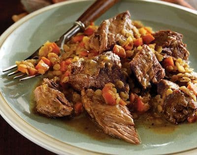 This recipe features slow simmered Chuck Blade Steaks with Onions, Carrots and Lentils lightly flavoured with Cumin.