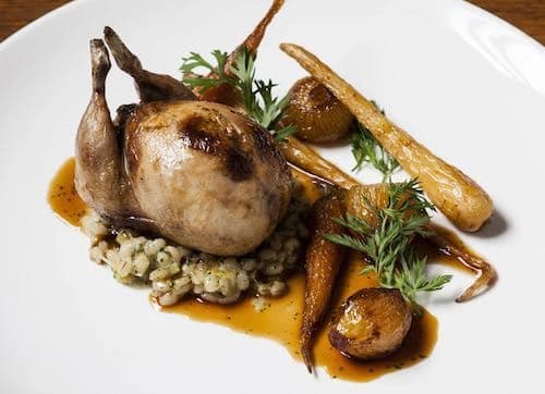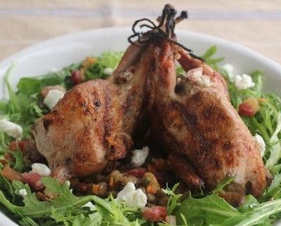 Grilled Quail, stuffed with Goats Cheese, Prosciutto and Thyme and then served on a bed of Lentils, Garlic, Carrots, Celery, Shallots and Crispy Bacon