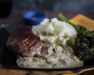 Steak and Chips gets even more special with rare, seared Game and homemade Fries with Mushroom creamy sauce