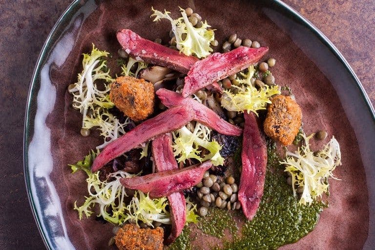 Wood Pigeon cooked sous vide to ensure perfectly cooked, rare Meat. To contrast the Pigeons rich, gamey flavour add braised Lentils, Salsa Verde, made with Anchovies, Capers and Parsley.