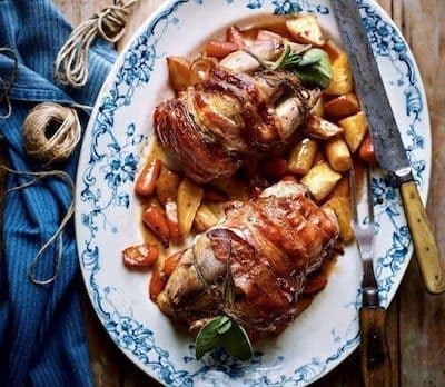 Remove Bacon, reduce heat to 220°c/ 425°f Gas Mark 7 and roast for another 20- 30 mins depending on the size