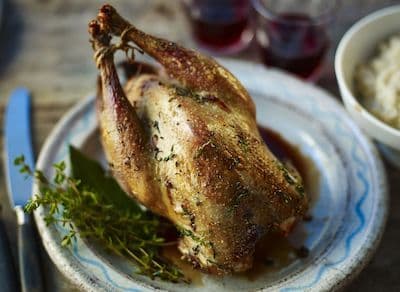 Rub the bird with a little Pork fat or butter, season with salt and pepper, then cover with rashers of Streaky Bacon.