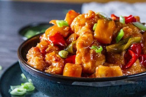 Tender chunks of Chicken coated in a crispy batter covered in a sweet and tangy Sauce with Pineapples and fresh Peppers. A take-away classic made easily in the Slow Cooker.