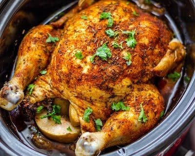 This is an easy recipe for slow cooker Whole Chicken that also includes Leftover Chicken recipe ideas. Rubbed with homemade seasoning and stuffed with Apples and Onion, this crock pot Chicken is a tasty & hassle-free midweek dinner.