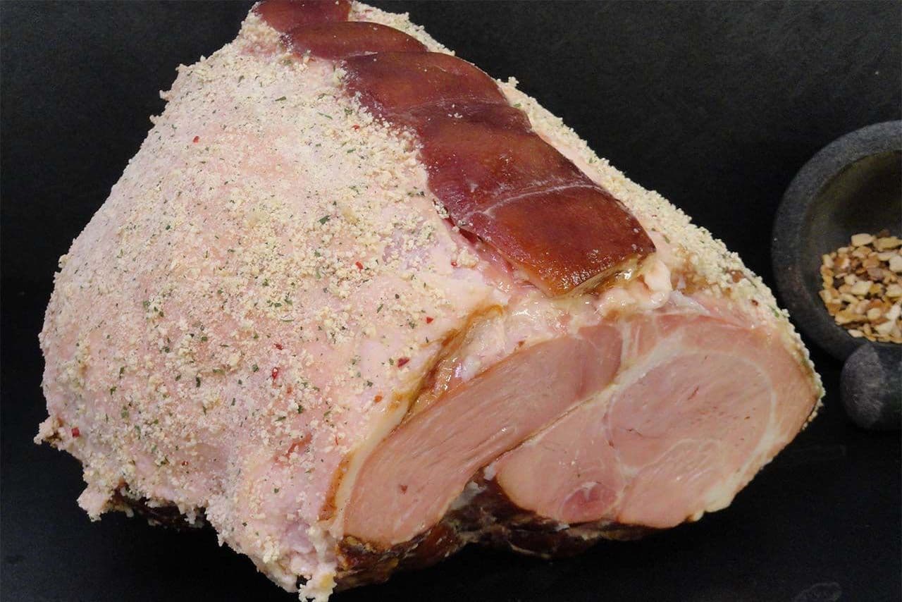 Prepared by hand on our own premises - Outdoor-reared, slow-roasted Ham - coated in Bread Crumbs and left off the bone for easy carving.